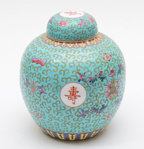 • Potiche em porcelana oriental esmaltado na cor verde, decoração floral e caracteres, Med: 21 cm x 19 cm de diâmetro