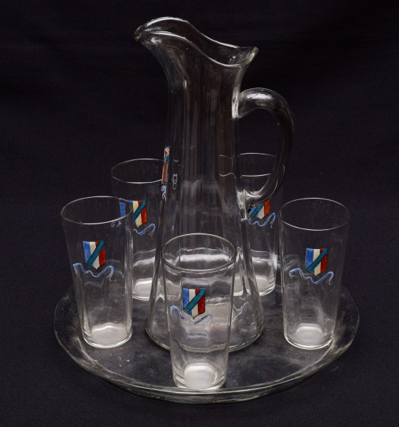 • ESPOIR ALSACE LORRAINE - Conjunto de 1 jarra, 1 bandeja e 5 copos, em vidro translúcido. Altura da jarra: 30cm; Copos: 13cm; Diâmetro do prato: 28cm.