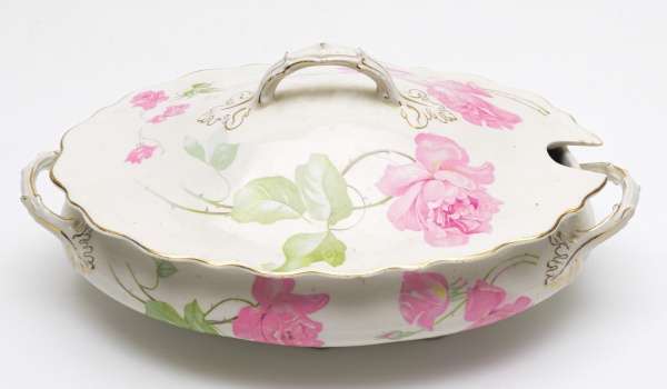 • JOHN MADDOCK & SONS - Antiga sopeira em faiança inglesa esmaltada e vitrificada na cor branca, com decoração floral e fios dourados. Apresenta pequeno fio de cabelo na borda. Medidas: 14 x 30 x 20cm.