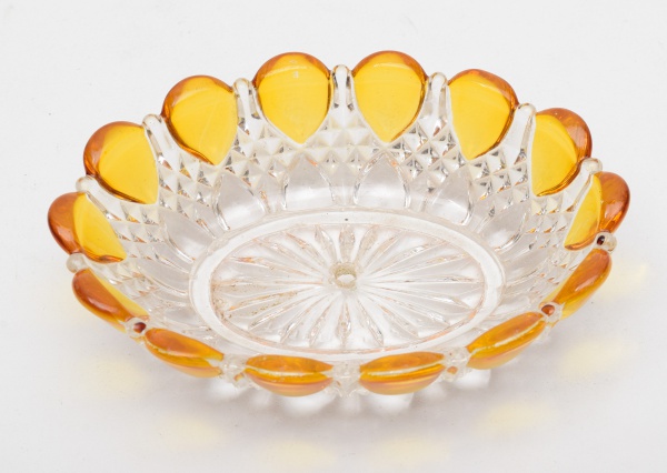 • VAL St LAMBERT - Peça em cristal belga, nas cores translúcido e âmbar, lapidação parte bico de jaca. Apresenta leves bicados na base. Medidas: 3,5 x 12 x 9cm.