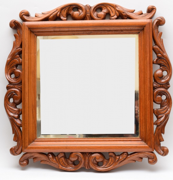 • Espelho emoldurado em madeira nobre entalhada, vidro em cristal bisotado. Medidas: 75 x 75cm.