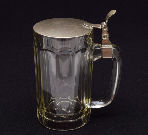 • Caneco para chopp em vidro translúcido com tampa em metal. Altura e diâmetro: 16 x 9cm.