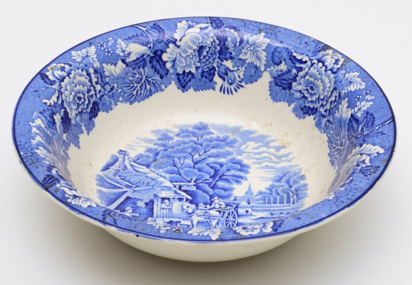 • WOODS WARE - Saladeira em faiança inglesa esmaltada e vitrificada com decoração fazendinha.  Apresenta bicado na borda. Altura e diâmetro: 6,5 x 23,5cm.