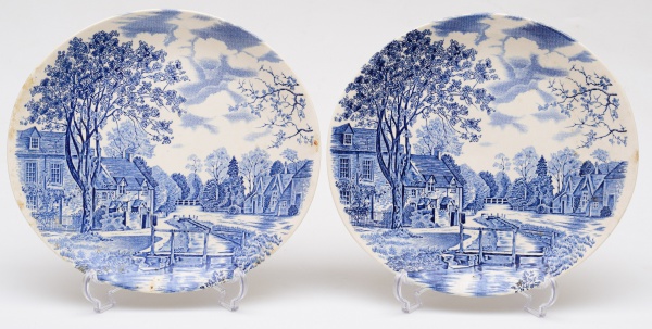 • Par de pratos rasos em faiança inglesa esmaltada e vitrificada com decoração dita borrão. 1 prato apresenta restauro na borda. Diâmetro: 22,5cm.