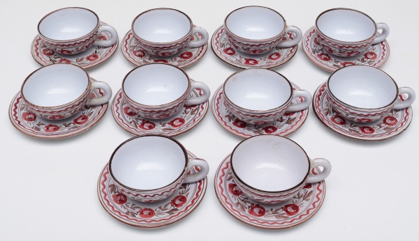 • Conjunto de 10 xícaras para café com pires,em porcelana esmaltada e vitrificada na cor branca, com decoração floral. 3 xícaras apresentam bicado.