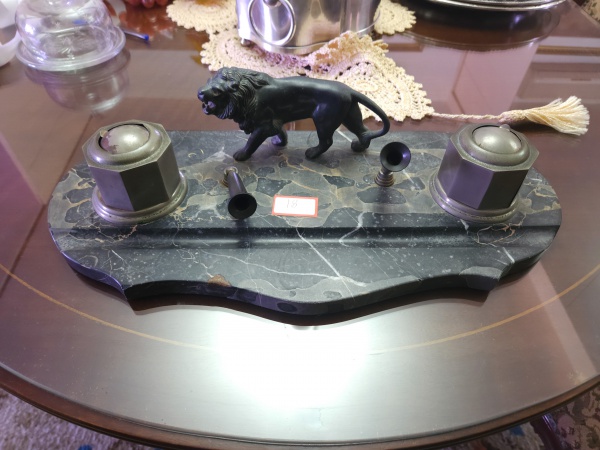 • Antigo tinteiro em mármore italiano, com escultura em bronze representando leão. Apresenta lascado no mármore. Medidas: 10 x 46 x 21cm. RETIRADA NA TIJUCA PELO ARREMATANTE, APÓS AGENDAMENTO PRÉVIO.