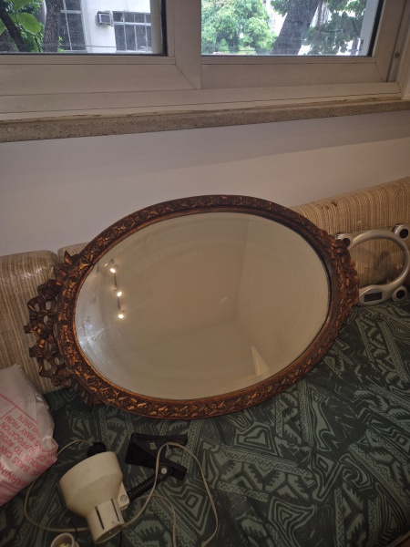 • Espelho bisotado anos 1945 oval em madeira entalhada patinada com resquícios de dourado  ( Retirada na Tijuca, somente com agendamento prévio )